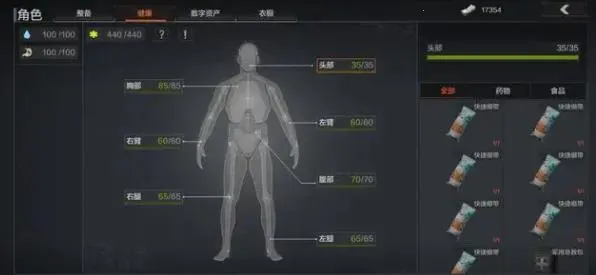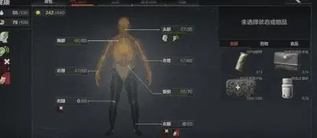 当口袋和弹挂中有医疗物资时我们可以快捷使用,但这样无法指定部位优先治疗,如果遇到医疗物资有限,身体又多处损坏的情况,可以打开背包后切换到健康页面针对各个部位进行治疗,比如先治疗腿部损坏,恢复移动能力。