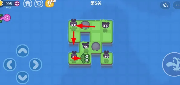 1、青蛙靠近蚊子所在格子时,蚊子会飞至空中,这是本关的核心难点。