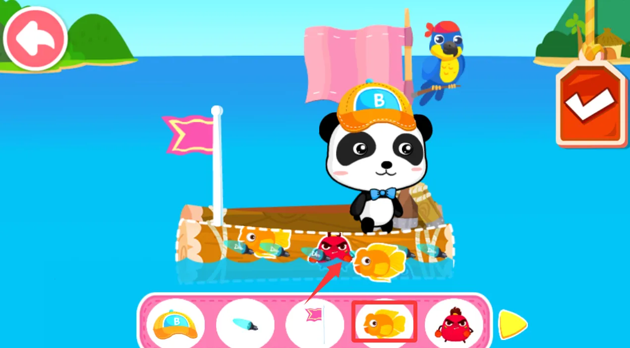 1、进入游戏点击下面的金鱼移动到船的侧面来装饰。